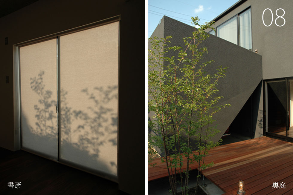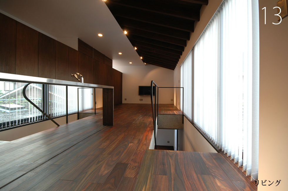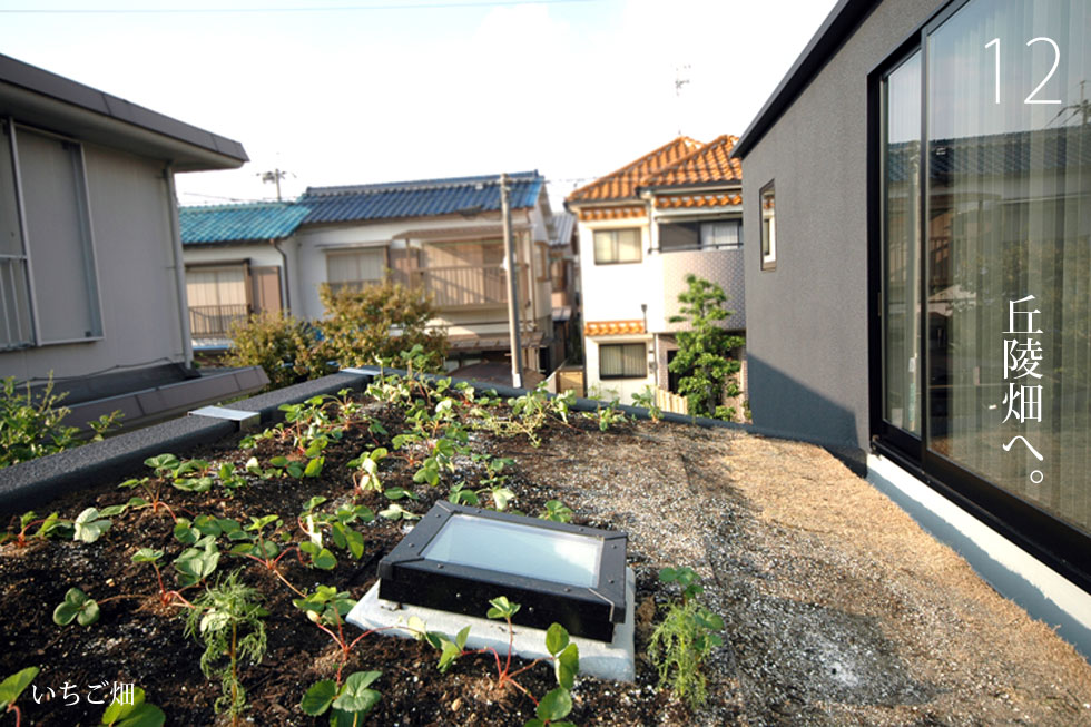 プライバシーを確保しつつ二階の明るさをふんだんに取り入れるために、屋上緑化を先上がりの斜面地とし、周囲からの視線をブロックしています.