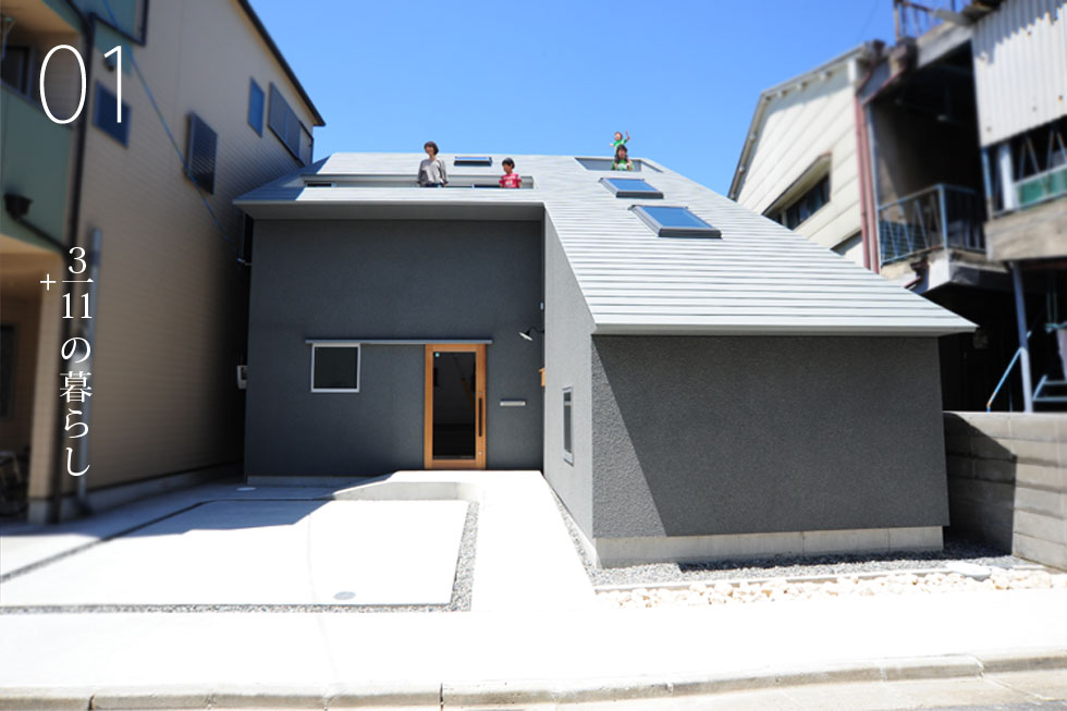 道路境界からわずかにバックして垂直に立上る壁をつくるのではなく、斜めの壁(屋根)を立ち上げることで、屋内のどこにいても、どこよりも広い開放的な空を感じ、その空は屋内から続くリビングのよう.
